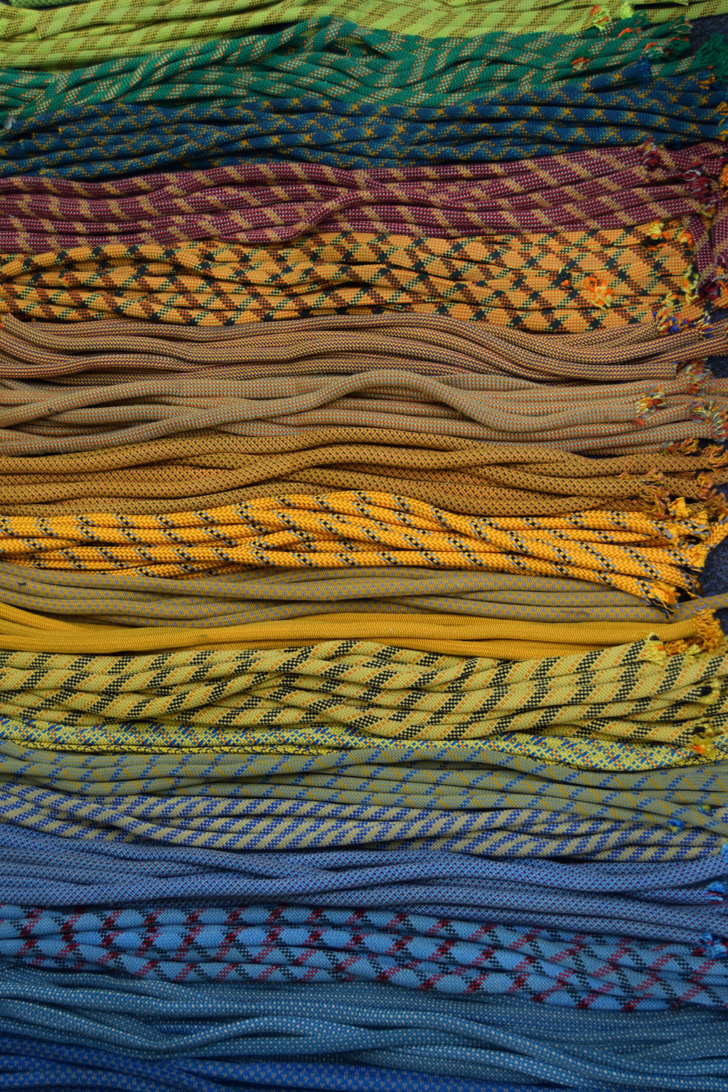 Our most eye catching reuse is with climbing rope. With the rope clean and ‘sheathed’ (the centre core is pulled out leaving a hollow tube) it can be flattened and stitched together to make a workable fabric. This we use to make chalk bags and belts, mainly, though we have made a number of rugs which look spectacular (if not a little laborious to make!).