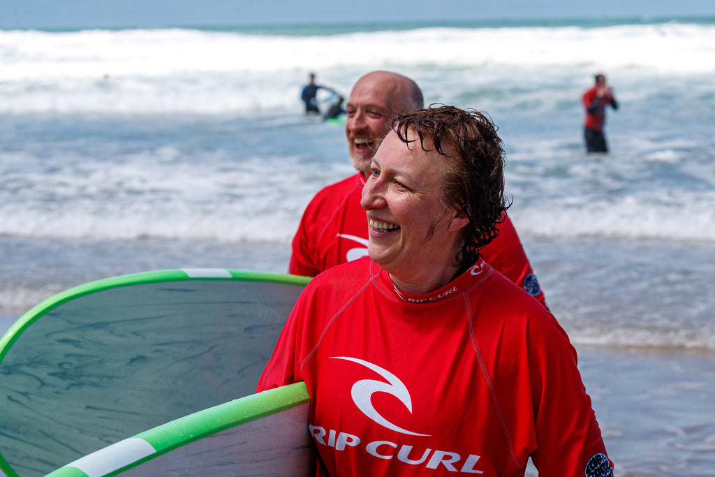 For starters, it brings the opportunity for pure, uninterrupted joy. Adults rarely get the chance to play - we are too busy 'adulting', working, being parents or partners, being responsible. Learning to surf turns all this on its head. Our sessions are fuelled by laughter, fun, enthusiasm and enjoyment. People learn to celebrate 'wipe-outs', share 'stoke', and master something new. They experience the ocean in all its sensory glory - the sounds, the energy, the taste, the whole-body pummelling, there is no time to think about the 'what if's' of life. And they learn to experience their bodies differently, forming new connections of strength and power with a body that they may feel has let them down.