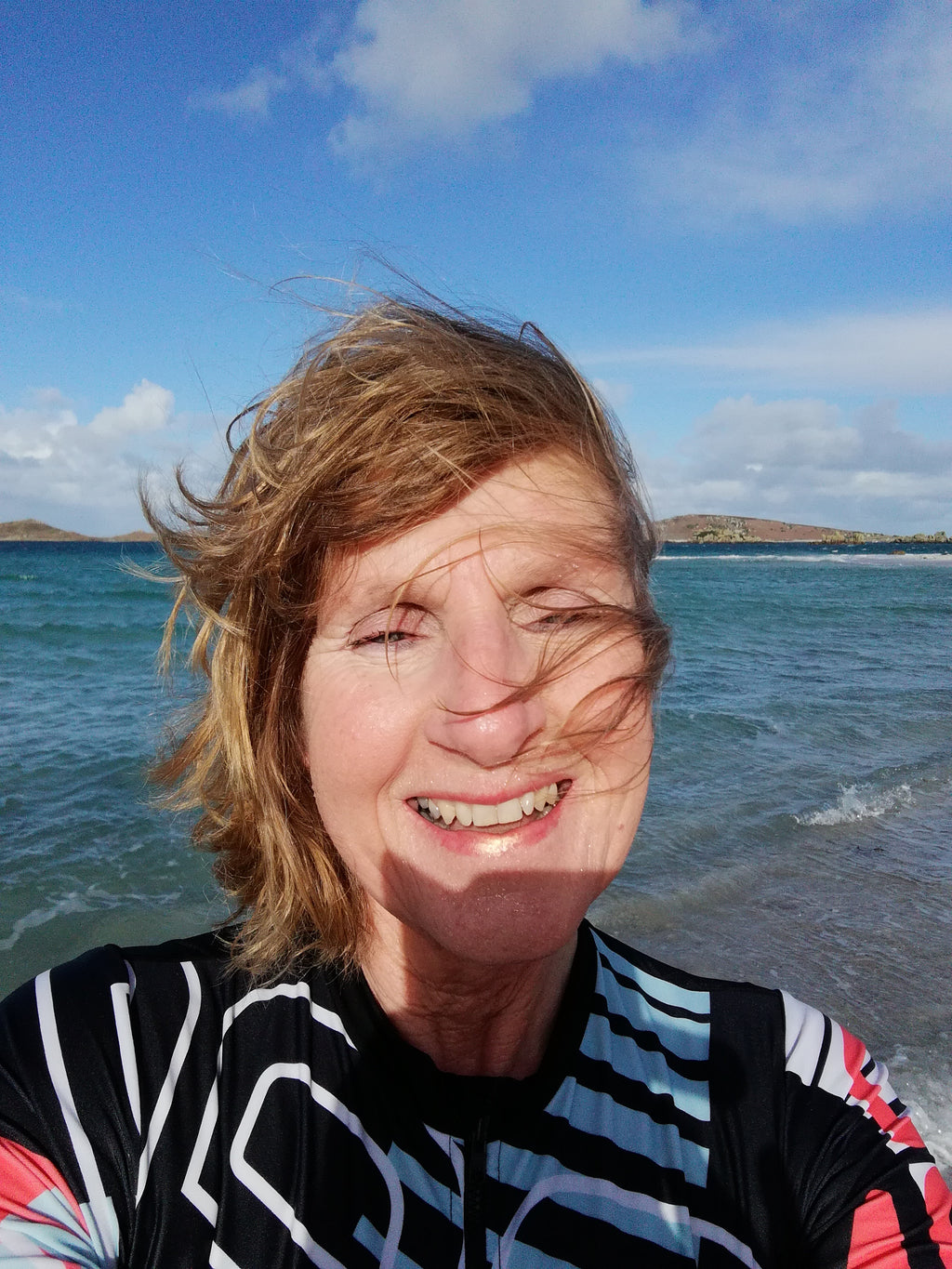 My day job is very creative; I manage an art Gallery, although currently I'm furloughed. I've been married to Steve for nearly 40 years and we have two grown up children both of whom live and work here on the island too. I run a fashion blog in my spare time and love that I can dress up every day for work in whatever takes my fancy. My office overlooks New Grimsby Bay offering me tantalising glimpses of the sea all day long. I spend my days checking the wind direction and state of the tide so that I can get the best swim of the day. Swimming isn't just my hobby, it's part of who I am. Without my daily swim I'm a fraction of my whole self, running on low until I'm topped up again by the energy of the sea.